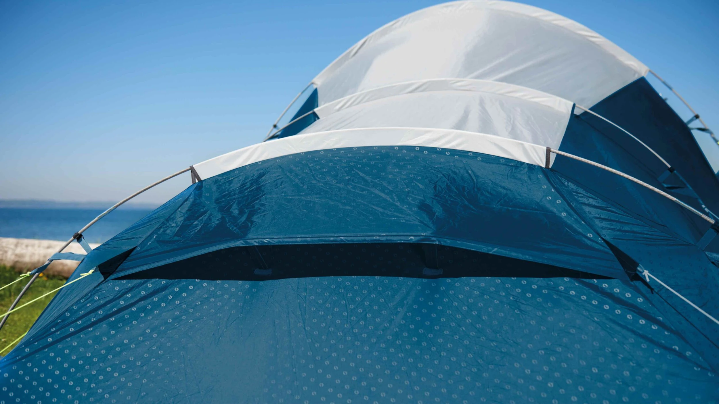 Hochwertiges Tunnelzelt für 4 Personen zum Campen mit dunklem Innenraum und großem Vorzelt.