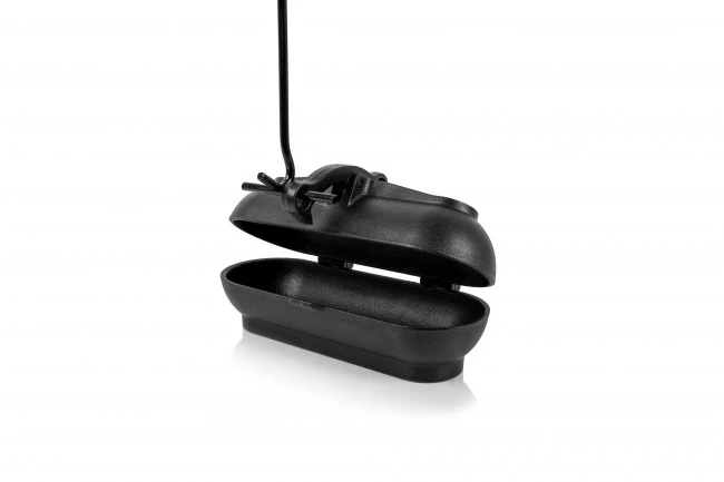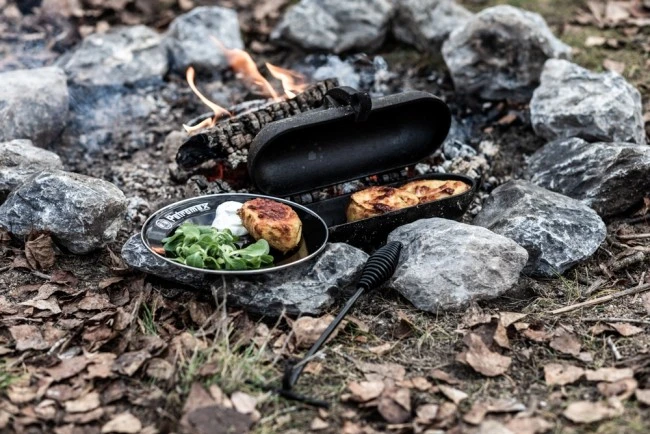 Der innovative Kippriegel mechanismus ist patentiert und ermöglicht eine einfache und sichere Handhabung. Hakt man den Deckelheber in die obere Öse, so kann man den Bräter ganz einfach in das Feuer legen oder herausnehmen. Hakt man ihn in die untere Öse, so lässt sich der Bräter öffnen um an den Inhalt zu gelangen.
