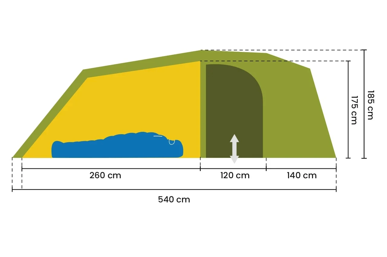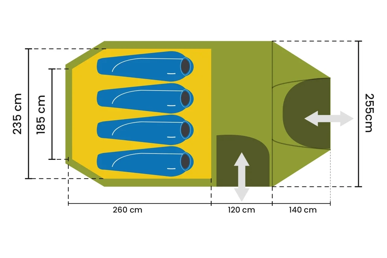 Das Zelt ist, trotz seiner Dimensionen, konsequent auf 4 Personen und die Nutzung auf dem Campingplatz oder den Transport mit dem Auto ausgelegt. In der großen Apside lässt sich das Gepäck verstauen und bequem kochen.