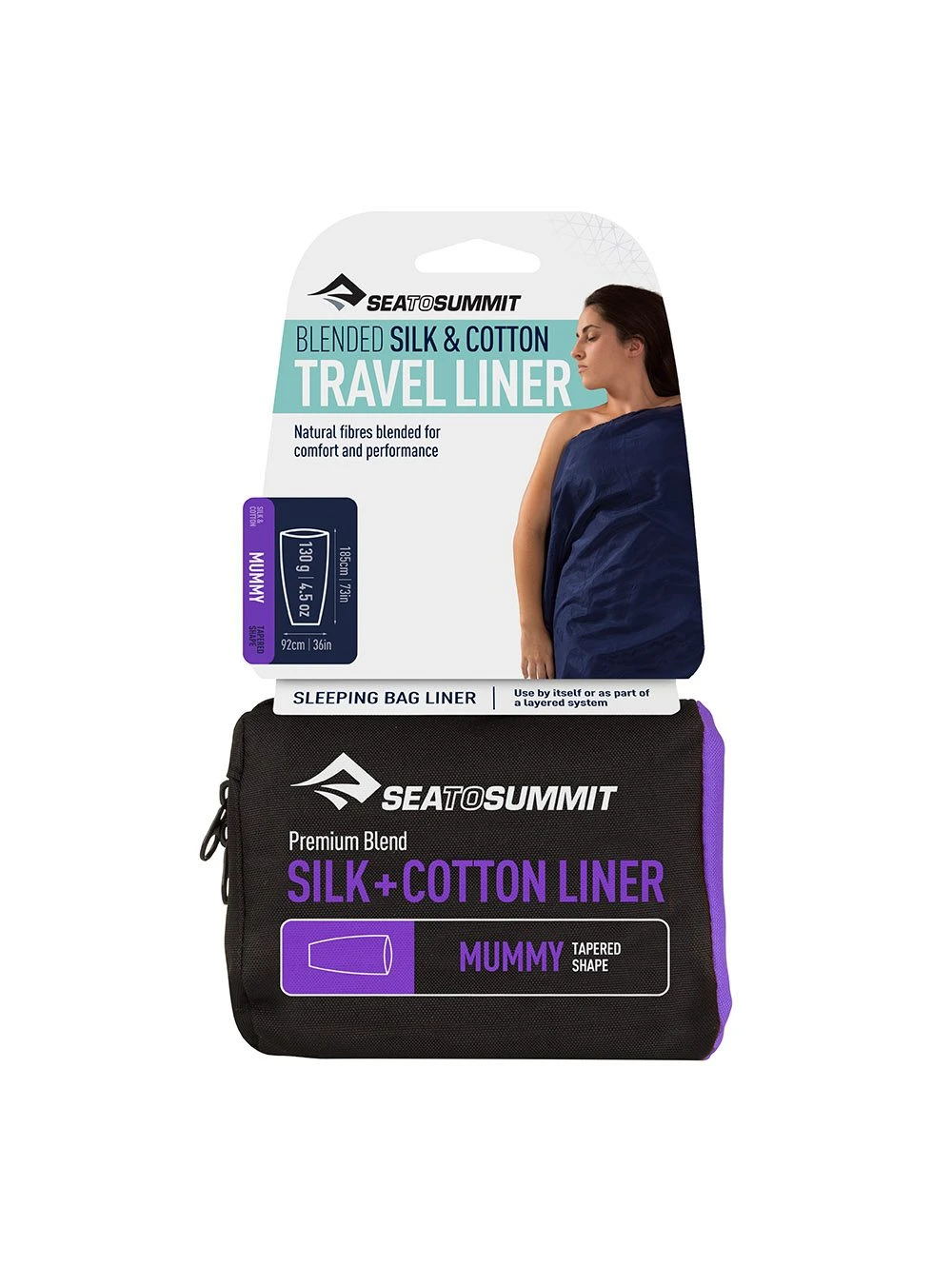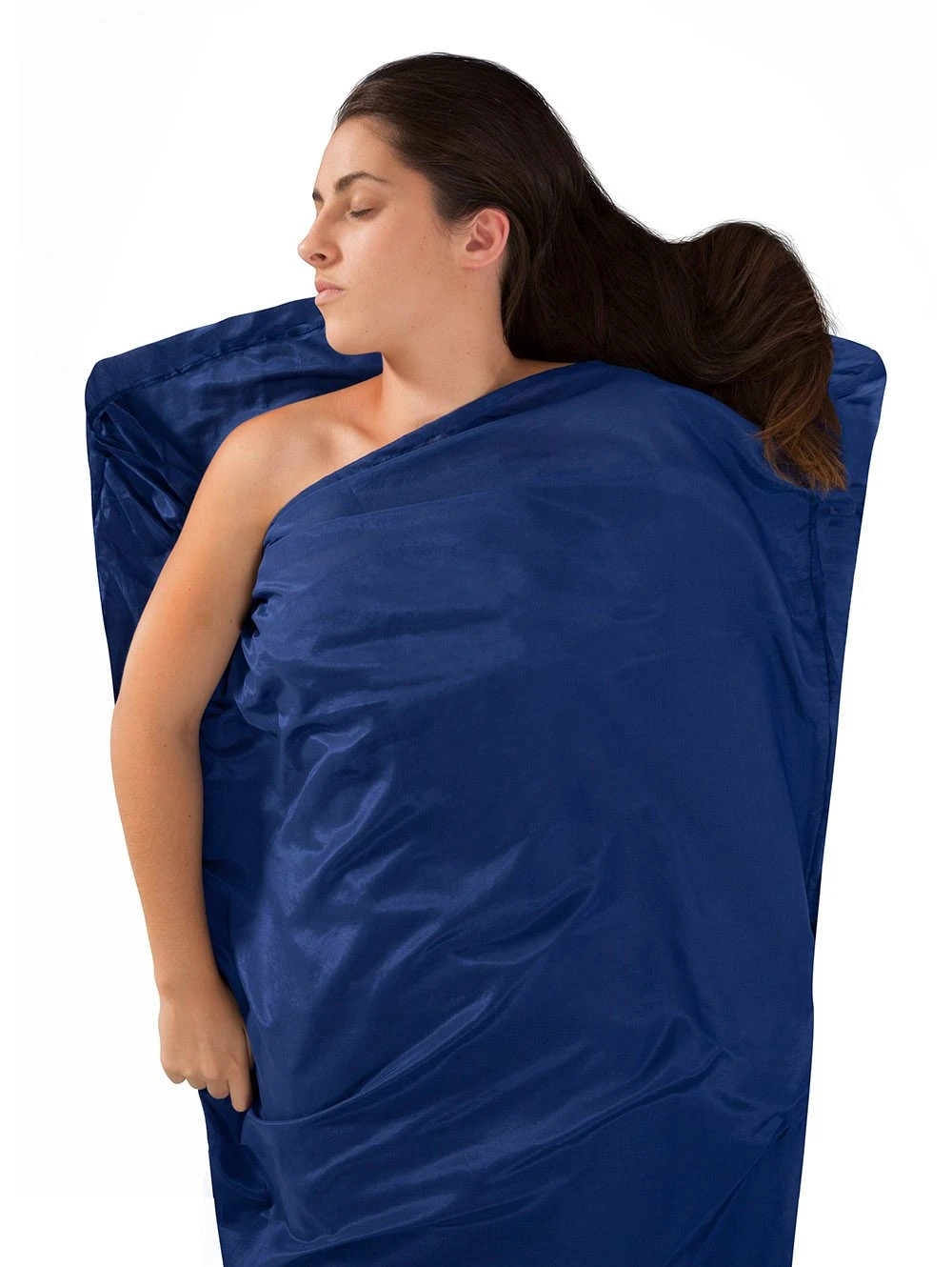 Das Gemisch aus Seide und Baumwolle ist ultraleicht und angenehm auf der Haut. Durch die Materialmischung wird das Schlafklima verbessert, es entsteht zusätzliche Wärmeleistung und der Schlafsack wird sauber gehalten.