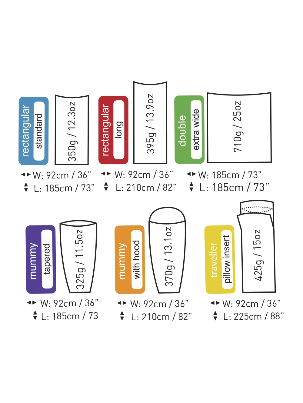 Der Travel Liner Mummy kommt in klassischer Mumienform und verjüngt sich nach unten. Durch den kompakten Schnitt wird Gewicht und Packmaß gespart.