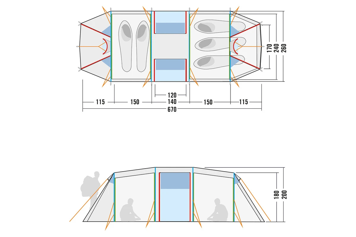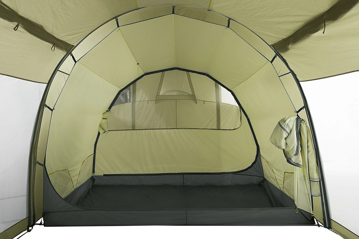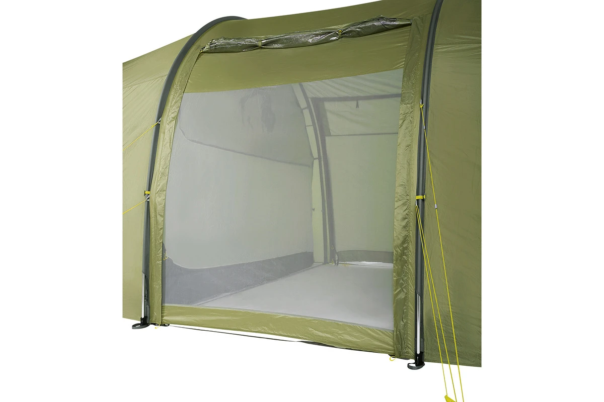 Ausgestattet ist das Zelt mit zwei gegenüberliegenden Seiteneingängen. Die Eingangstüren lassen sich als Sonnendach aufstellen (Stangen nicht enthalten). Die Schlafkabinen sind mit Moskitonetz ausgestattet, sodass die kleinen Plagegeister draußen bleiben. Damit es nicht dunkel im Zelt wird, gib es in den Seiteneingängen verschließbare Fenster.
