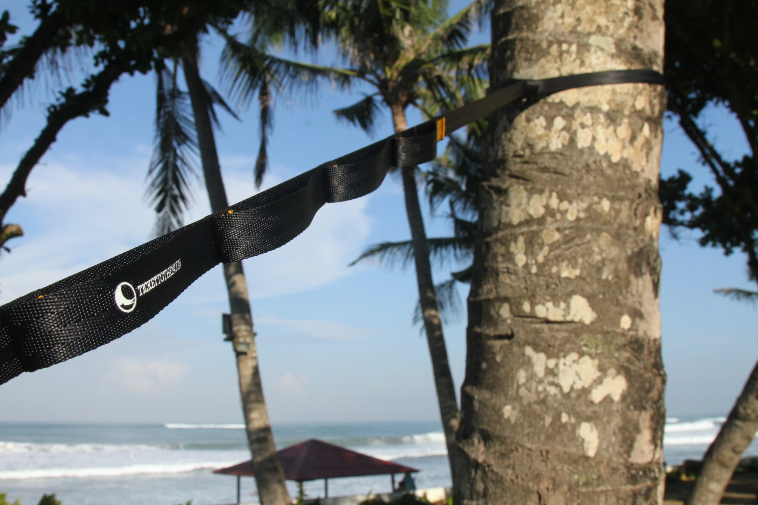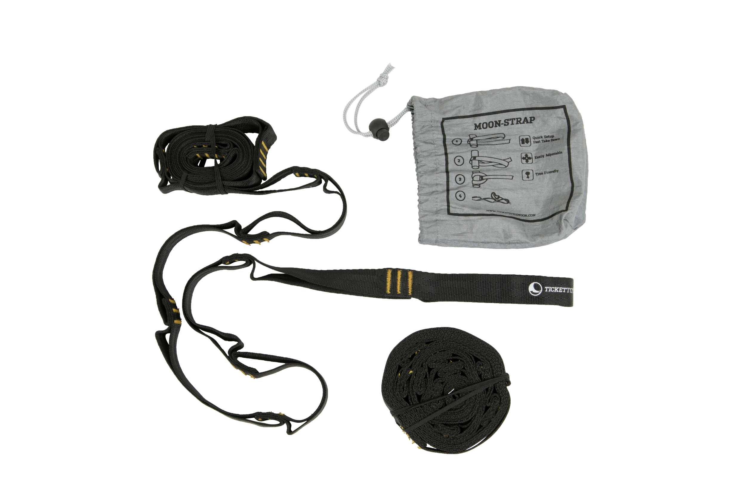 MoonStrap um den Baum legen, durch den Loop fädeln und deine Hängematte in die gewünschte Öse einhängen. Einfach kann das Setup deiner Hammock nicht laufen. Dank des breiten Bandes verletzt du auch bei längerer Anwendung den Baum nicht.